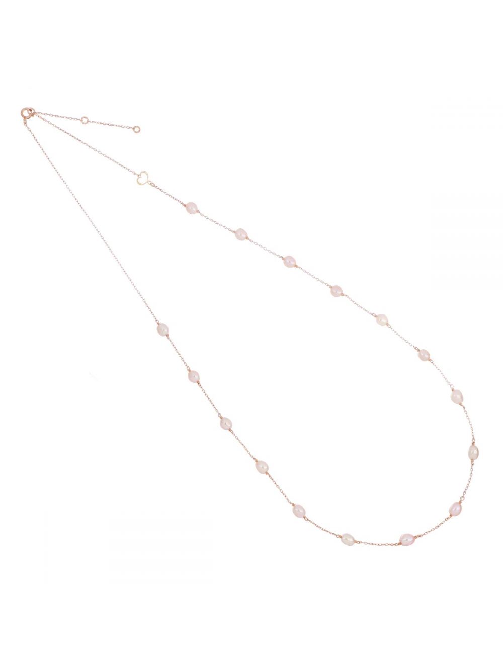 Girocollo lungo in oro rosa 18 carati con perle ovali rosa di 5 mm x 6 mm ciascuna.