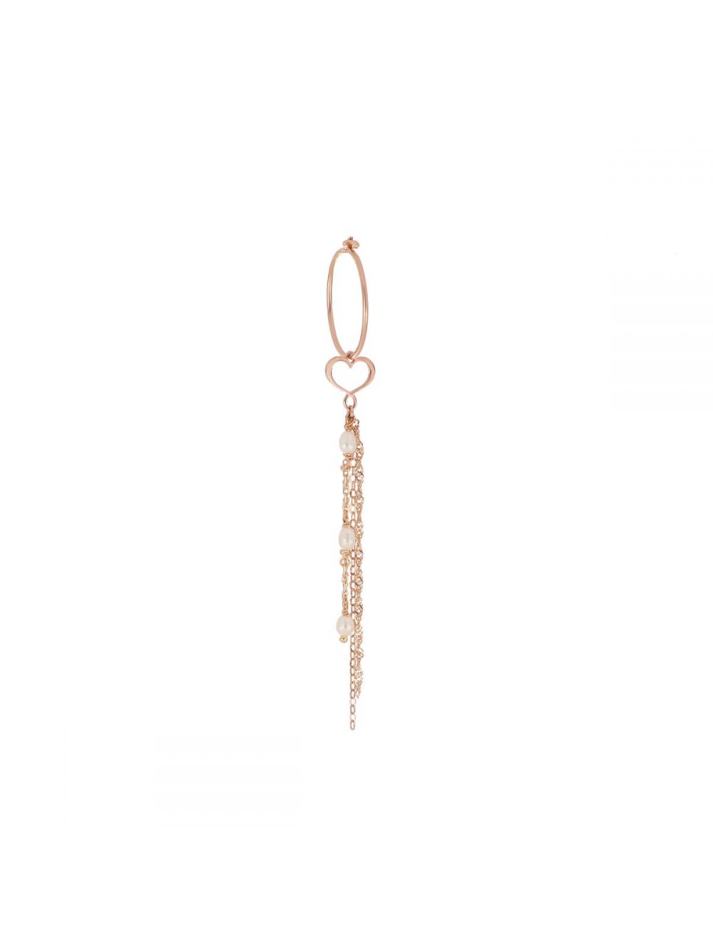 Orecchino a cerchio singolo realizzato in oro rosa 18 carati con cuore Maman traforato e cascata di catene e rosario di perle mignon.